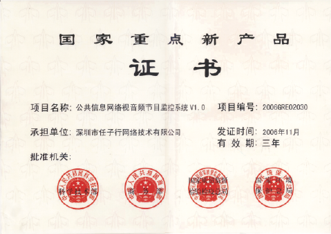 2.¡°¹«¹²ÐÅÏ¢ÍøÂçÊÓÒôƵ½ÚÄ¿¼à¿ØÏµÍ³V1.0¡±ÈÙ»ñ¡°¹ú¼ÒÖØµãвúÆ·¡±³Æºô ¡£